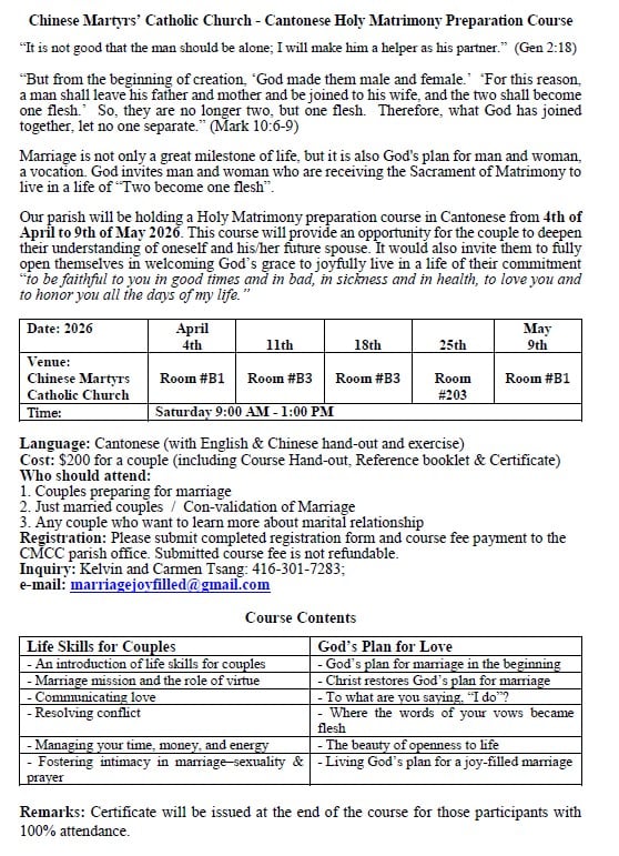 Saturday, April 04, 2026 to Saturday, May 09, 2026   |   Chinese Martyrs Catholic Church 中華殉道聖人堂